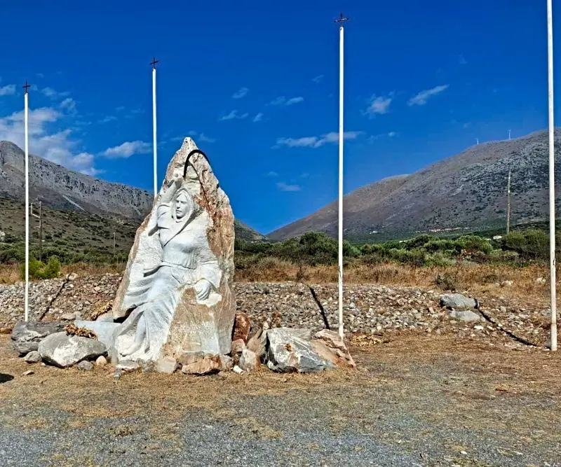 Πλησιάζοντας την παραλία, το βλέμμα σας θα τραβήξει το επιβλητικό άγαλμα της δρεπανοφόρας Μανιάτισσας. Αυτό το έργο τέχνης, που δεσπόζει στο τοπίο, είναι ένας φόρος τιμής στην πλούσια ιστορία και την ανθεκτικότητα των ντόπιων. Φιλοτεχνήθηκε ως προσφορά από τα Αιολικά Πάρκα, μια κίνηση που είχε βρει αντίθετους τους ντόπιους κατοίκους ως προς την εγκατάσταση ανεμογεννητριών στα βουνά της Μάνης.