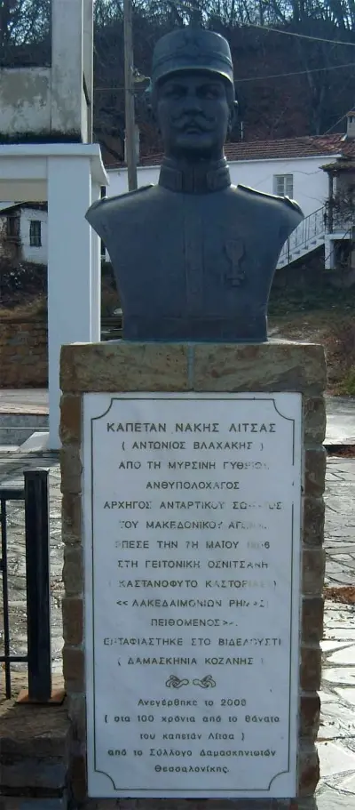 Νάκης Λίτσας (Αντώνιος Βλαχάκης.Αρχηγός Ελληνομακεδονικών σωμάτων, αγωνισθείς εις Μακεδονίαν υπό ψευδώνυμο «Νάκης Λίτσας» και πεσών την 7 Μαΐου εις την Οσνίτσανη της Μακεδονίας, 1906.